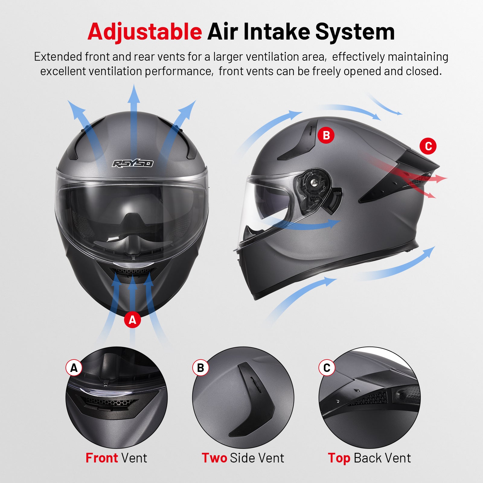 - Outstanding Safety Features - RSYSO full face helmet made with high-strength ABS shell and multi-density EPS lining, equipped with high-strength quick-release buckles, compliant with DOT FMVSS218 safety standards.