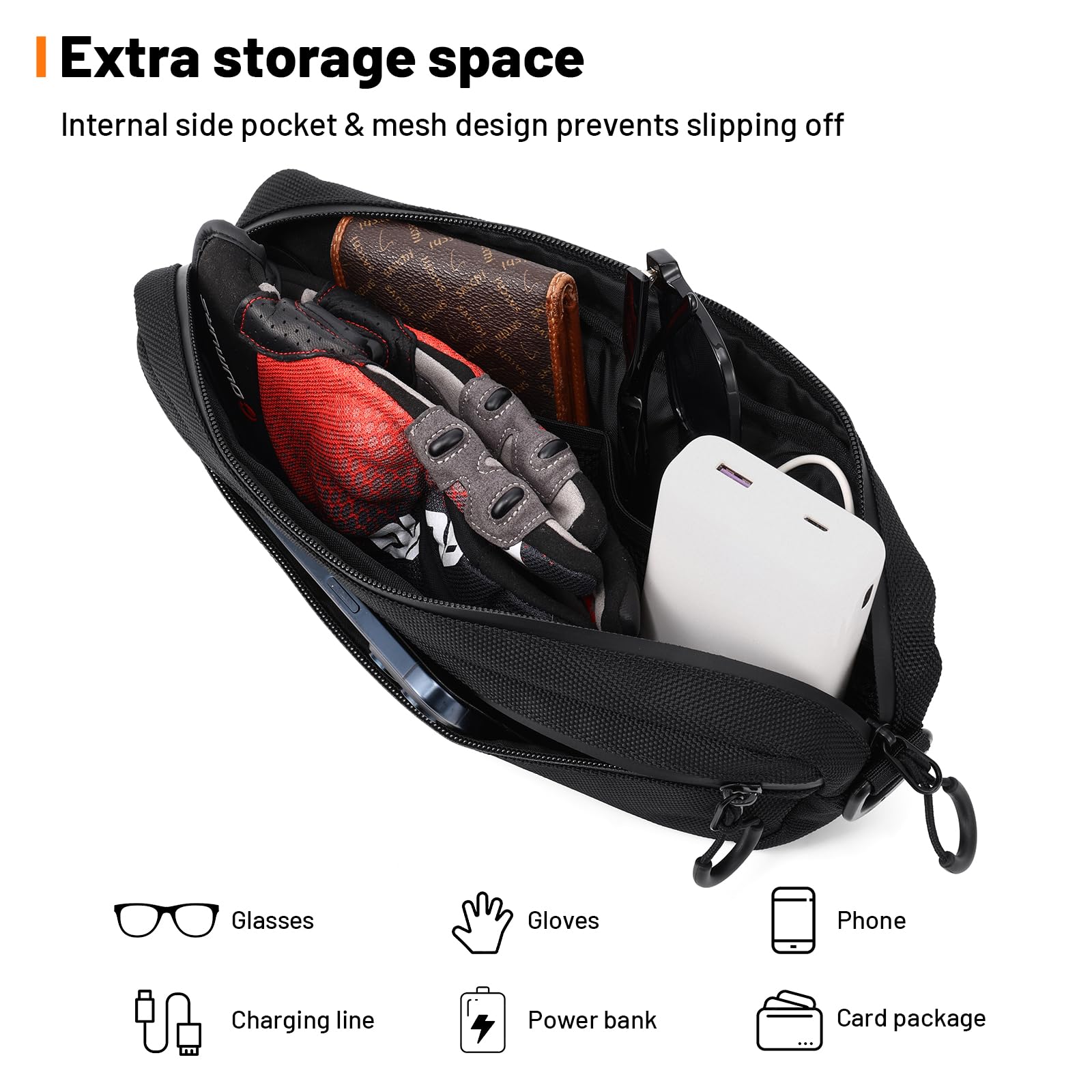 2, the motorcycle handlebar bag has two pockets, small pockets can be put: mobile phone. Large pockets can be put: sunglasses, gloves, card bag, charging cable, charging treasure