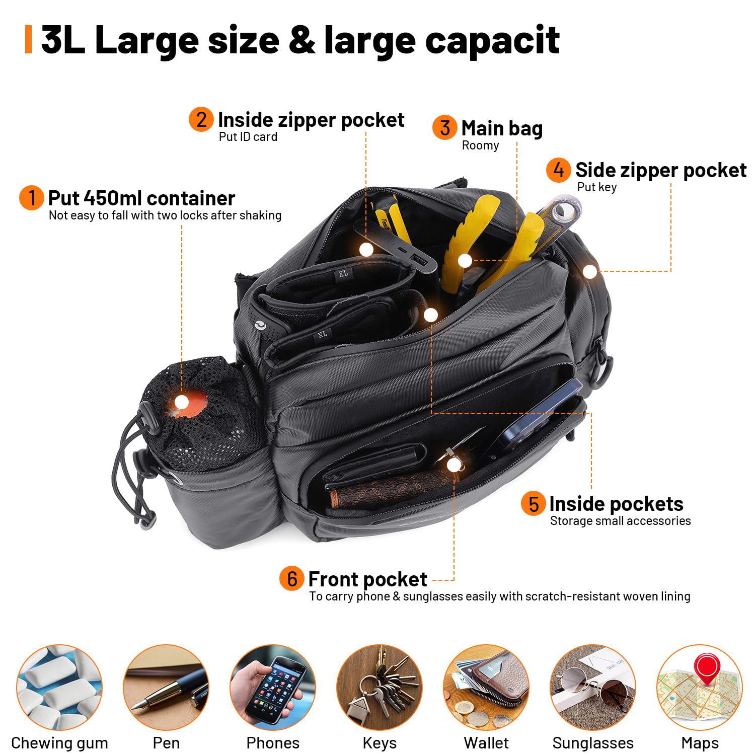 2、6 separate pockets, including a zippered inner pocket, a inner pocket, a main compartment, a front pocket, an outer side water bottle pocket, and an outer side zippered pocket.